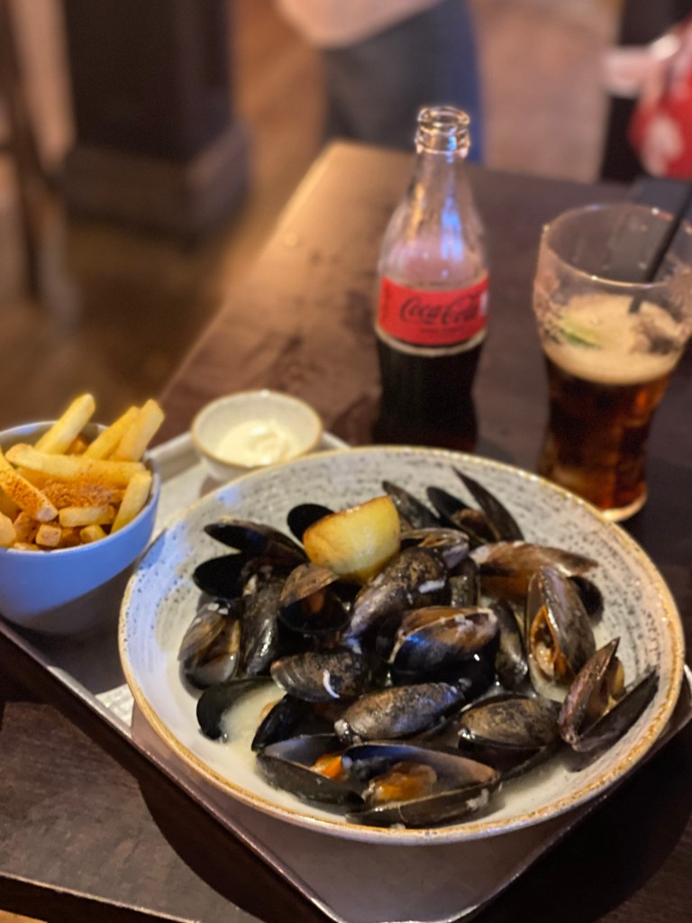 The Anchor- Bankside Pub in Southwark – on the South Bank of the River Thames, offered Scottish mussels and fries. One of my favorite dishes. If you are celiac double check with the kitchen because you may need to skip the fries, sadly. And if you want ketchup you’ll need to ask because in true UK fashion the meal is served with mayo.